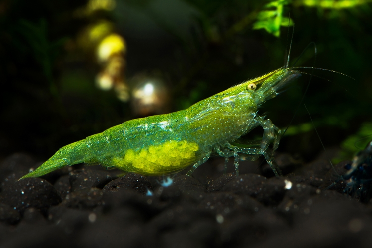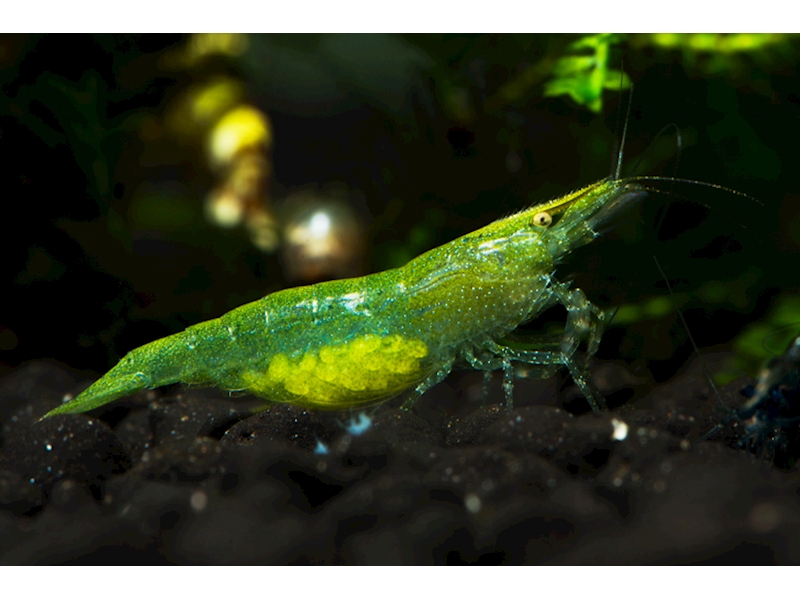 Podrobný popis: Základní zbarvení je zelené, které přechází do hnědé. Je schopná měnit barvu podle podmínek v akváriu. Dospělé samice jsou sytě zelené, zelenou barvu mají i vajíčka.
