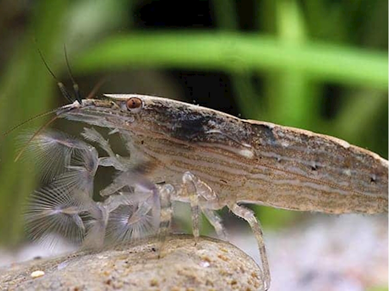 Podrobný popis: Základní zbarvení je velmi variabilní, může být tmavohnědé, černé, oranžově i červené. Hřbetem se táhne jasně bílý nebo žlutý pruh. Na bocích po celé délce těla jsou naznačeny drobné světlé proužky. Samec je v dospělosti větší a robustnější s mohutným prvním párem kráčivých končetin. Nemá klepeta, ale vějířky, kterými zachytává ve vodě rozptýlené zbytky potravy.