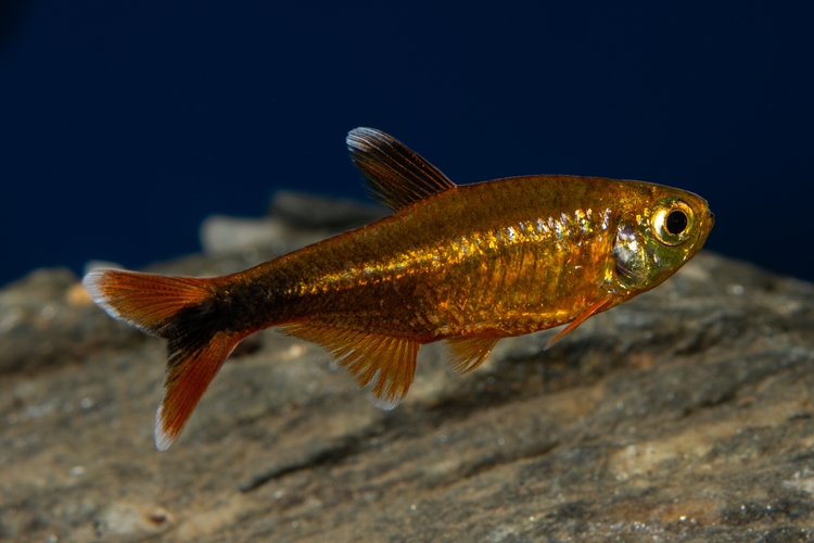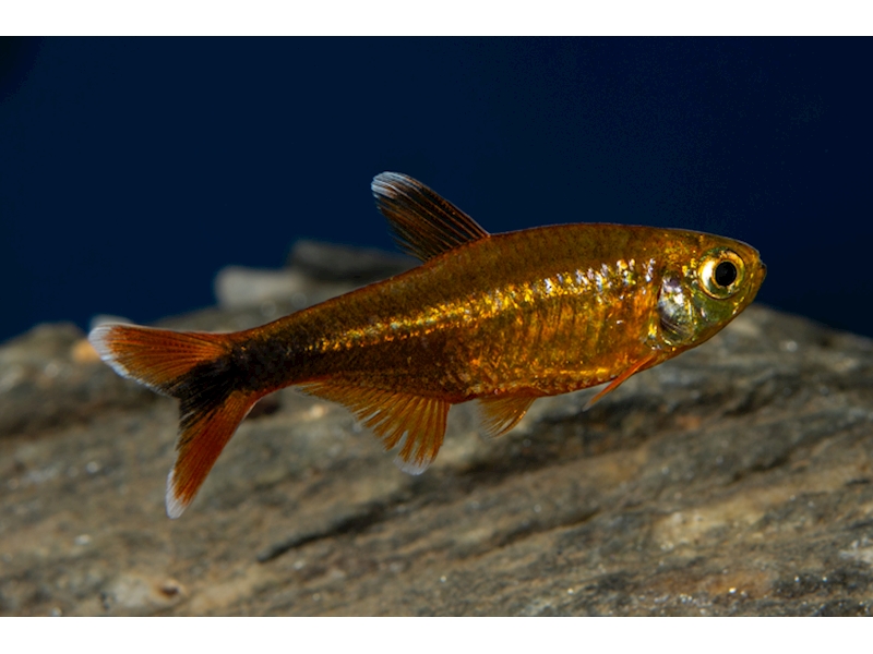 Podrobný popis: Mírumilovná hejnová ryba vyžadující velký prostor k plavání a skrýše. Tělo má stříbřitě zlaté. Na koncích ploutví má bílé špičky. Divocí samečci mohou honit pomalejší ryby. Žije ve skupinách v kyselejší vodě v hustém porostu.