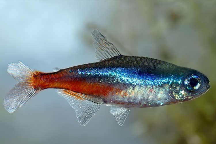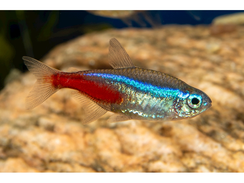 Podrobný popis: Čilá, mírumilovná, hejnovitá rybka. Miluje hustě osázená akvária, která nesmí být příliš osvětlena. Na bocích má po celé délce těla výrazný modrý pruh, pod ním v zadní části těla jasně červené zbarvení. U samic je tělo oblejší. Začínající akvaristé ji mohou zaměnit s neonkou červenou. Neonka červená má červené celé břicho, tetra má jen červený pruh.