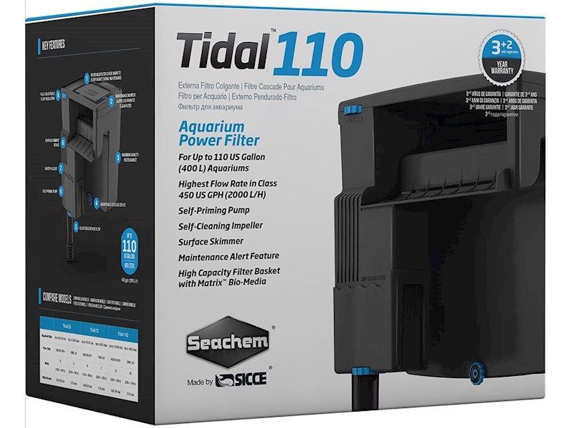 Společnosti SEACHEM nabízí tříletou záruku na závěsné filtry Tidal, které jsou dodávané ve třech velikostech. Tidal 110 je vhodný pro akvária až do 400 l objemu a nabízí průtok 2000 l/hod. Filtr se velmi snadno instaluje a zajištuje tichý a bezproblémový chod.