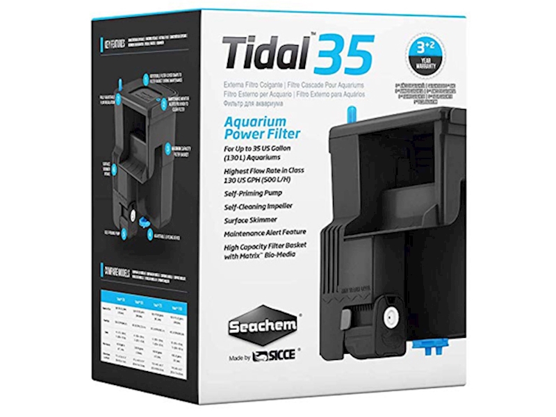 Společnosti SEACHEM nabízí tříletou záruku na závěsné filtry Tidal, které jsou dodávané ve třech velikostech. Tidal 35 je vhodný pro akvária až do 130 l objemu a nabízí průtok 500 l/hod. Filtr se velmi snadno instaluje a zajištuje tichý a bezproblémový chod.