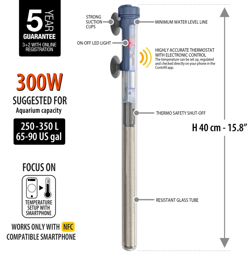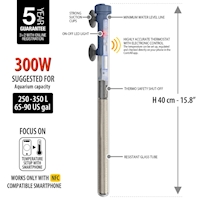 Inovativní řada topítek vybavená PATENTOVANÝM "bezkontaktním" elektronickým ovládáním teploty. Nejjednodušší a nejrychlejší způsob nastavení teploty ohřívače. Bezplatná aplikace pro záznam a přesné nastavení teploty vody podle potřeby. Celý rozsah od 50 wattů do 400 wattů. Nastavitelné od 15°C/59°F do 35°C/95°F s přesností tolerance ± 1°C/2°F.