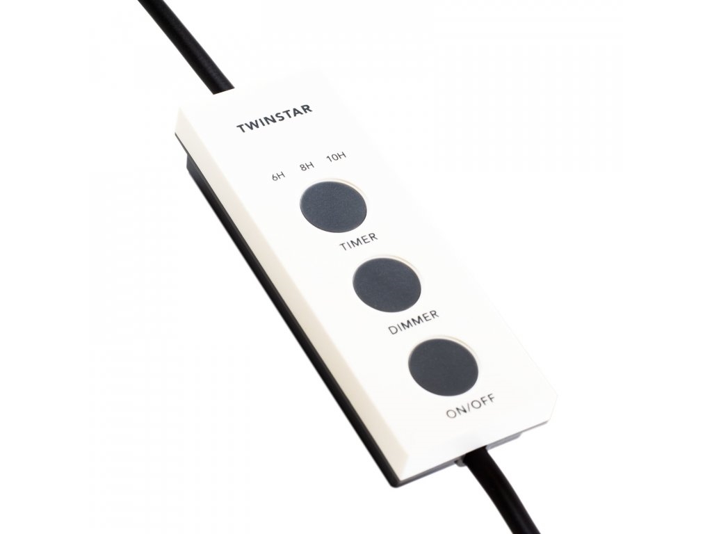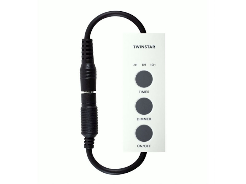 Stmívač Twinstar je vhodný pro všechny LED Twinstar bez předinstalovaného stmívače. Stmívač je vybaven tříkrokovou funkcí časovače na 6, 8 a 10 hodin a zajišťuje konstantní osvětlení. Stisknutím tlačítka lze regulovat jas v sedmi krocích. Automatický 10 minutový východ a západ světla zajišťuje příjemné ráno i večer. Světlo lze také rychle zapnout a vypnout vypínačem.