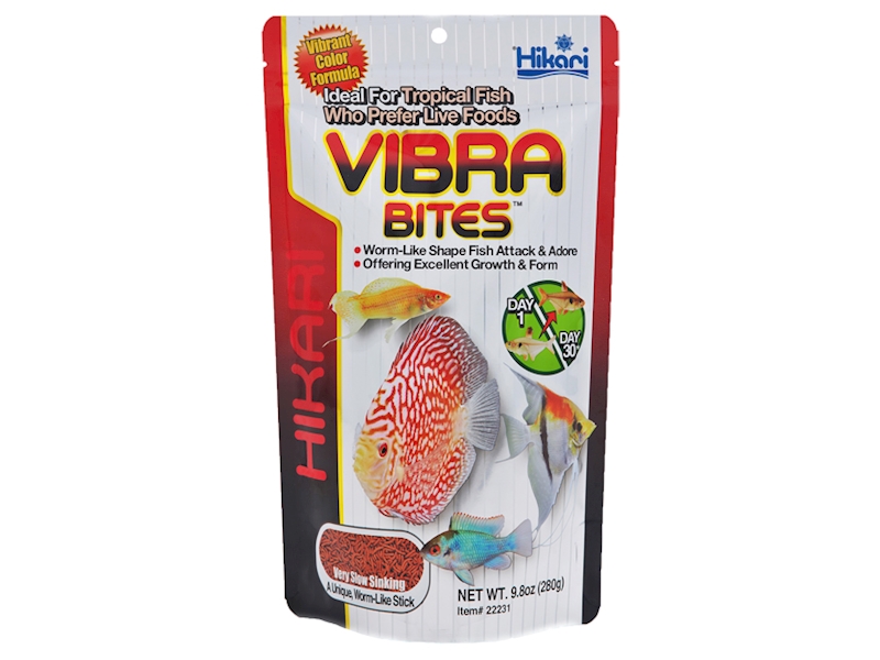 Kompletně bezpečná alternativa krmiva HIKARI® TROPICAL VIBRA BITES ™ bylo vyvinuto tak, aby pelety měly tvar a vzhled živé krvavé patentky, kterou ryby tak zbožňují. Jedinečně vyvážená formulace nabízí výživné hodnoty klasických patentek a přitom neexistuje riziko parazitárních a bakteriálních nákaz. Jedinečné přísady nabízejí vynikající chuť, které ryby neodolají.