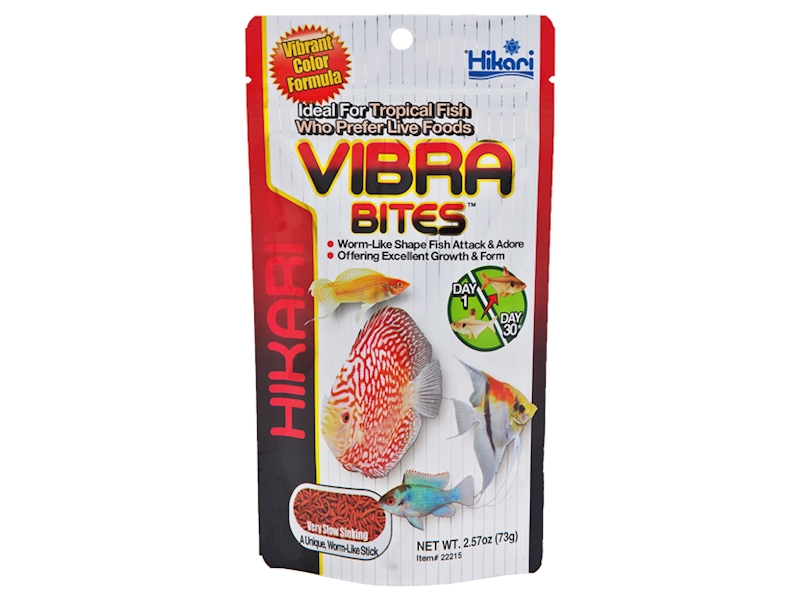 Kompletně bezpečná alternativa krmiva HIKARI® TROPICAL VIBRA BITES ™ bylo vyvinuto tak, aby pelety měly tvar a vzhled živé krvavé patentky, kterou ryby tak zbožňují. Jedinečně vyvážená formulace nabízí výživné hodnoty klasických patentek a přitom neexistuje riziko parazitárních a bakteriálních nákaz. Jedinečné přísady nabízejí vynikající chuť, které ryby neodolají.