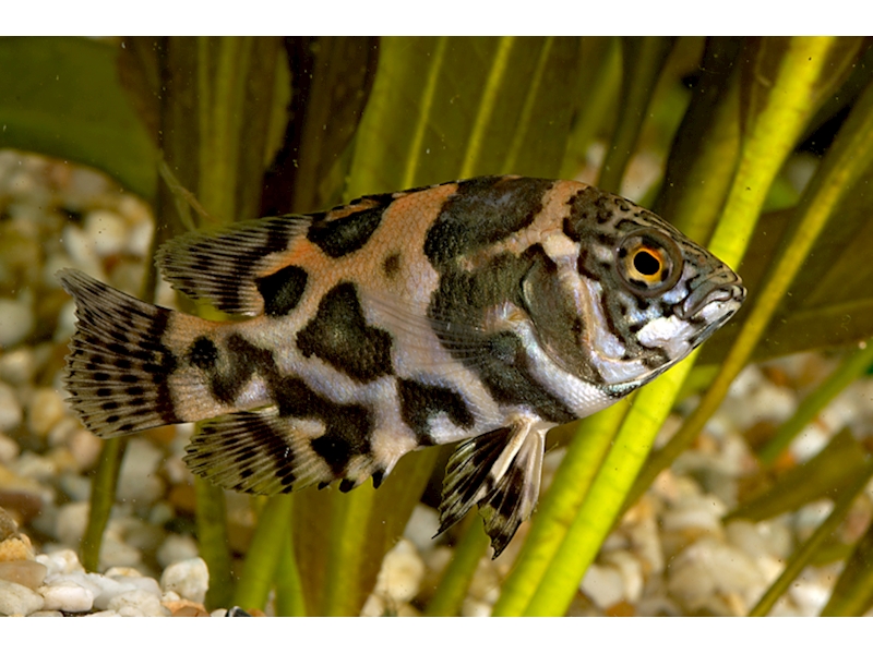 Podrobný popis: Není dobré dávat je do akvária s malými rybkami, lepší je chov mít třeba s kančíky nebo třeba s piraněmi. Nebojí se zaútočit na ruku, takže je třeba opatrnosti, ovšem lze je naučit přijímat potravu z ruky. V nádrži neustále něco přehrabují a přemísťují. Je třeba počítat s tím, že občas poškozují rostliny, nebo je vytahují ze substrátu. Nenáročné ryby, které se často chovají v akváriu - v mládí barevně atraktivní. Brzy ale vyrostou v poměrně velké a dravé ryby. Jsou nenáročné na kvalitu vodu, ale díky jejich velké žravosti je nutné vodu často vyměňovat a dobře filtrovat. Pro chov je nutno použít velké akvárium s dostatkem místa pro plavání. Všechny předměty v akváriu je vhodné dobře upevnit a zajistit, jelikož tato ryba dokáže přesunout či zdemolovat skoro všechno. Při stresu se položí na dno a dlouhou dobu předstírají, že jsou mrtví. Dostávají i svárlivou náladu a perou se. Utrpěná zranění se jim potom rychle zahojí a potrhané ploutve se zacelí. Další názvy = Acara compressus = Acara hyposticta = Astronotus ocellatus zebra = Astronotus orbiculatus = Cychla rubroocellata = Lobotes ocellatus. Anglicky se mu také někdy říká Oscar.